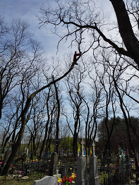 Если же дерево находится рядом с жилыми домами, хозяйственными постройками, линиями электропередач, на кладбище и пр., то при самостоятельном удалении такого дерева, не имея практического опыта организации удаления дерева по частям, можно повредить как своё, так и чужое имущество.