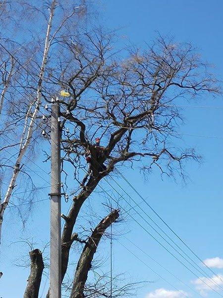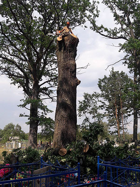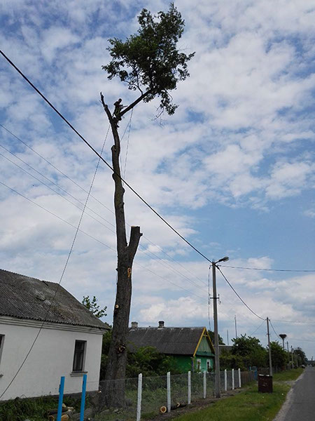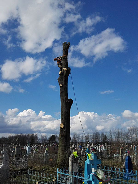 У бабули в деревне Внучки на участке в проводах рос огромный вяз и при грозах было страшно и за постройки, и за электричество. Через Интернет нашёл координаты специалистов из УдалимДерево.бел. Я позвонил и мне объяснили, что могут убрать дерево методом промышленного альпинизма. Мы договорились о примерной сумме и через пару дней парни приехали и спилили его. Теперь моя бабуля осталась довольна и не переживает за дом. Спасибо Вам.